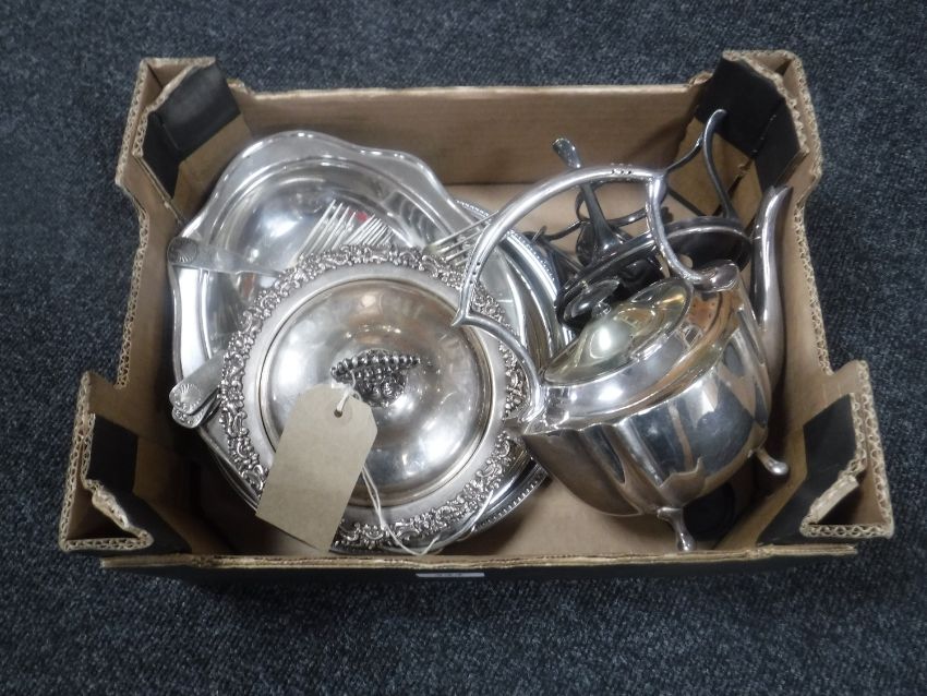 A box of silver plated spirit kettle, muffin dish etc