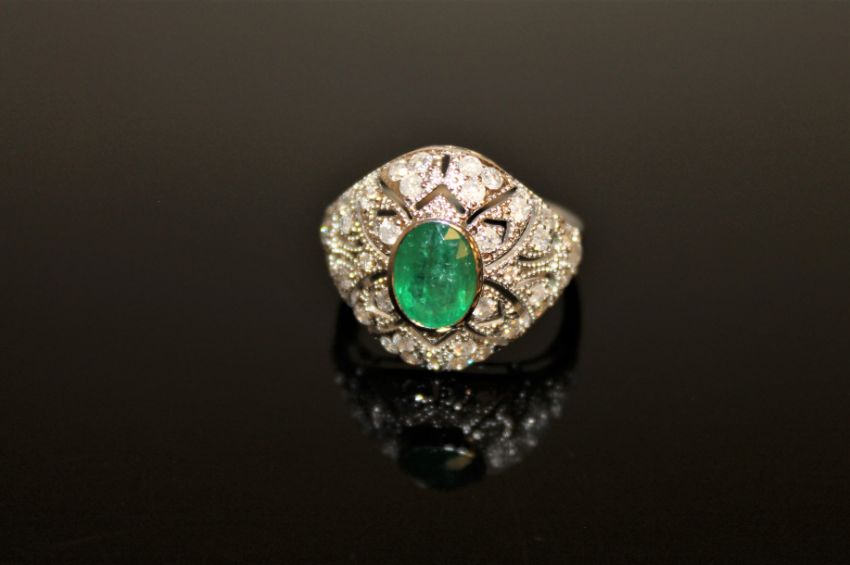 An 18ct white gold emerald and diamond ring, the oval-cut medium-green emerald weighing 0.71 carat, within thirty-eight brilliant -cut diamonds in a pave setting, totalling 0.71 carat, of SI/P1 clarity and G/H colour, with certification, size J/K