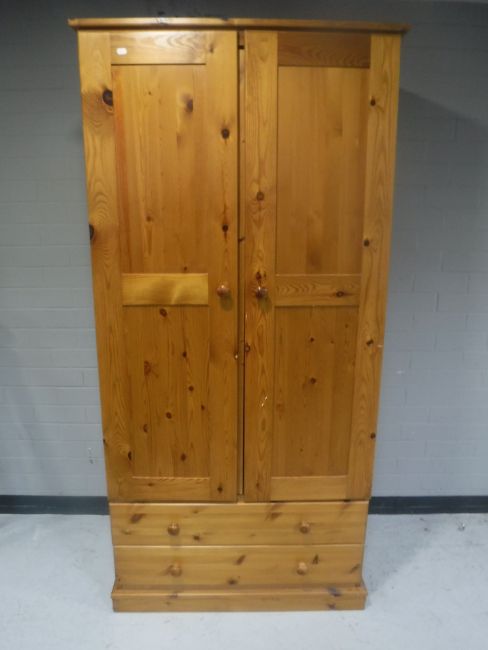 A pine double door wardrobe fitted two drawers