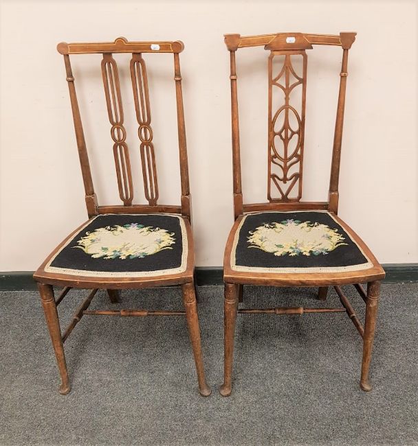 A pair of inlaid mahogany late Victorian bedroom chairs, width 42 cm. (2)