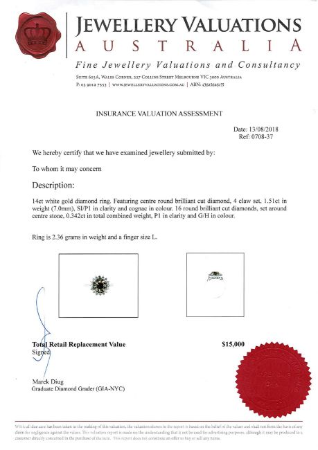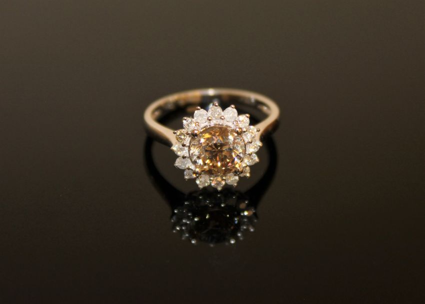 A 14ct white gold diamond cluster ring, the central brilliant-cut cognac-coloured diamond weighing 1.51 carat, of SI/P1 clarity, within a border of sixteen brilliant-cut diamonds with a total weight of 0.342 carat, of P1 clarity and G/H colour, with certification, size L
