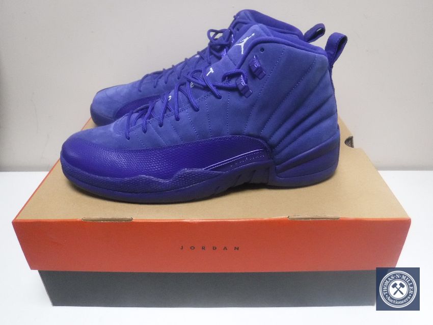 A pair of Nike Air Jordan 12 Retro Deep Royal Blue and White basketball sneakers, size UK 11, in box with receipt, unused