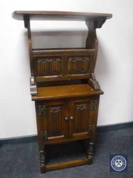 A Priory Oak linen fold double door cabinet and matching mag rack