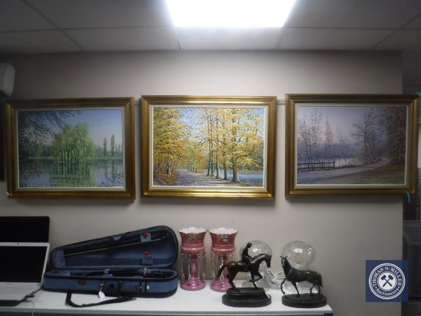 Three late 20th century Jan Wheaton gilt framed oils on canvas depicting rural scenes