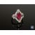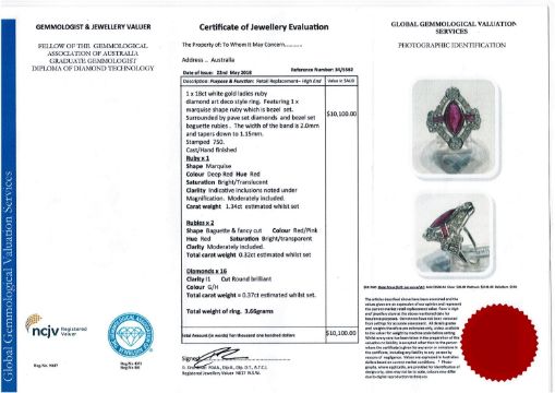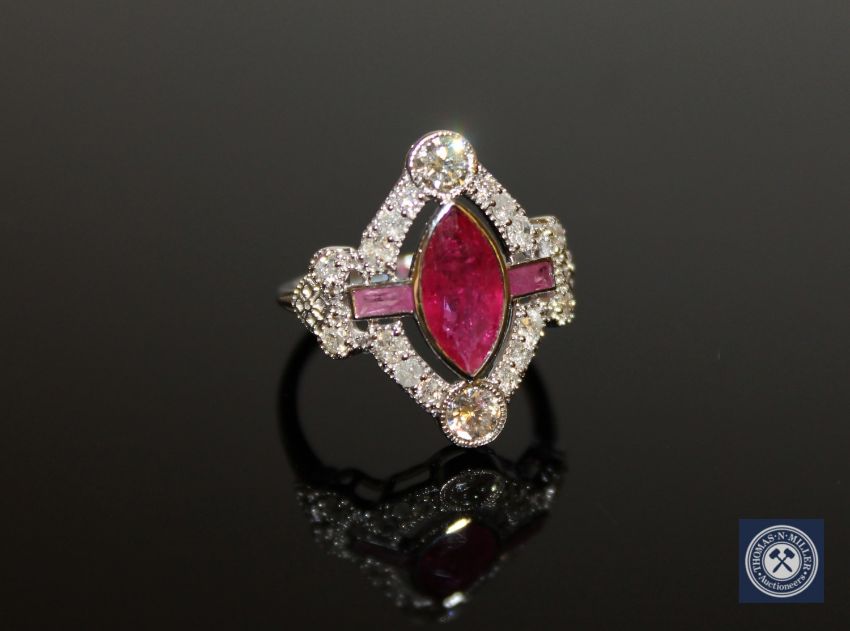 An 18ct white gold ruby and diamond ring, a central marquise-cut deep red ruby weighing 1.34 carat, flanked by two medium-red, fancy cut rubies, surrounded by sixteen brilliant-cut diamonds, the diamonds having a total weight of 0.37 carat, of G/H colour and I1 clarity, with certification, to a plain polished shank, size J1/2