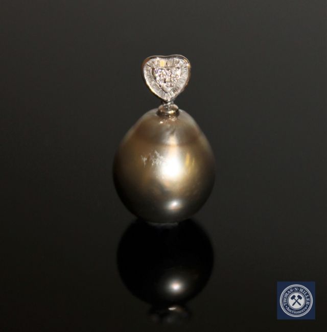 An 18ct white gold pearl and diamond pendant, the drop-shaped grey/green Tahitian pearl, suspended from a heart-shaped white gold bail set with six brilliant-cut diamonds and twenty-three baguette-cut diamonds, the total diamond weight 0.07 carat, of SI clarity and H colour, with certification, height 27mm