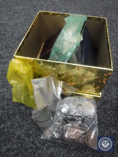 A box of various coins, £2 coins, decimal coin set etc.