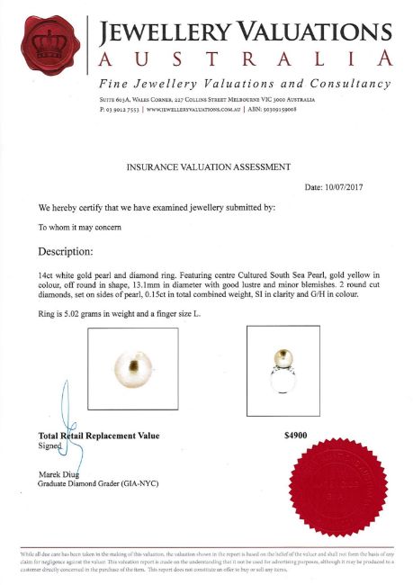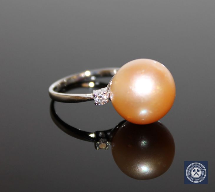 A 14ct yellow gold pearl and diamond ring, the gold/yellow cultured South Sea pearl flanked by two brilliant-cut diamonds, the total diamond weight 0.15 carat, of G/H colour and SI clarity, with certification, to a plain polished shank, size L