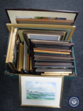 A box of pictures, prints, etchings, needleworks etc