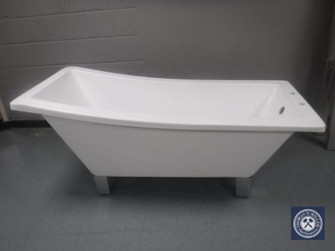 A contemporary shaped bath on chrome metal feet