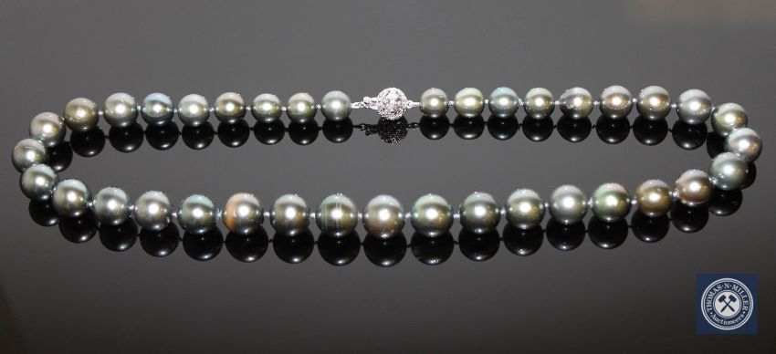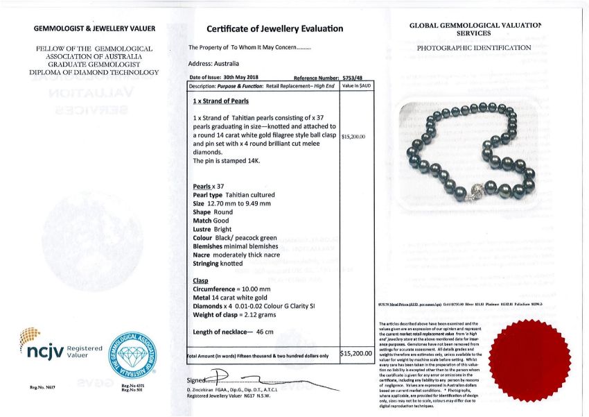 A 14ct white gold pearl and diamond necklace, thirty-seven black/peacock-green Tahitian pearls, the filigree clasp with four grain-set brilliant-cut diamonds, length 46cm, with certification