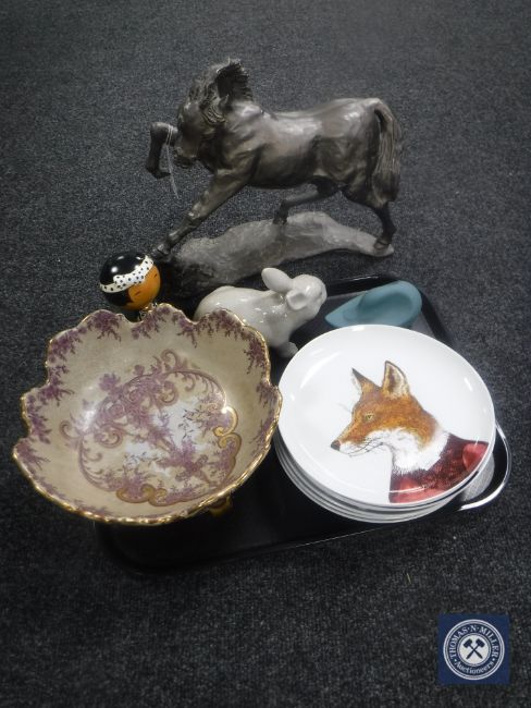 A contemporary figure of a galloping horse, tray of set of seven Rachel Kozlowski plates depicting animals, gilded pottery scalloped edge bowl, rabbit figure etc