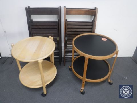 Two two-tier trolleys and four folding kitchen chairs