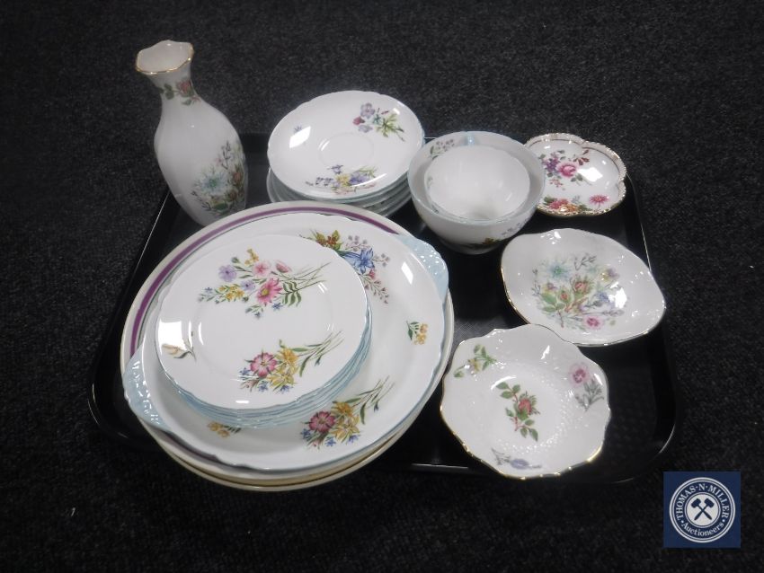 A tray of fifteen pieces of Shelley Wild Flowers tea china, Aynsley vase and dishes, Royal Crown Derby posies, etc