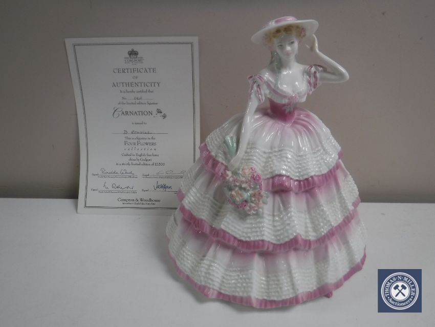 A Coalport The Four Flowers Collection figure, Carnation, number 161 or 12500 with certificate.