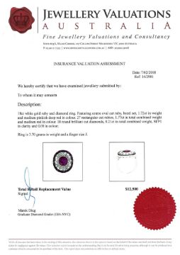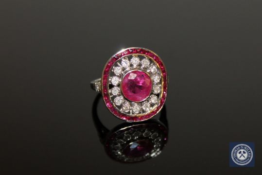 An 18ct white gold ruby and diamond cluster ring, a central oval-cut, deep red ruby weighing 1.72 carat, surrounded by eighteen brilliant-cut diamonds in a pierced frame, bordered by twenty-seven rectangular-cut medium-red rubies in channel settings totalling 1.77 carat, , the diamonds having a total weight of 0.21 carat, of G/H colour and SI/P1 clarity, with certification, to a plain polished shank, size J1/2