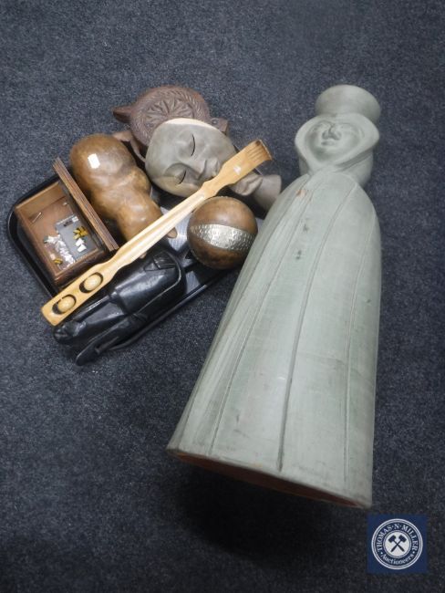A tray of wooden wall mask, trinket box, back scratcher, large pottery candle holder and a wooden twist stem candle holder