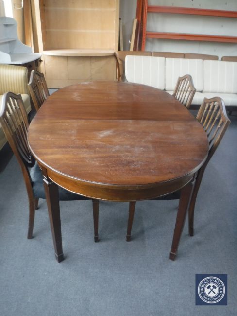 An antique oval dining table with leaf and four chairs
