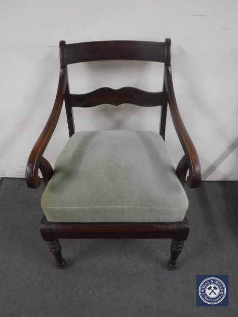 An antique mahogany scroll arm armchair