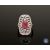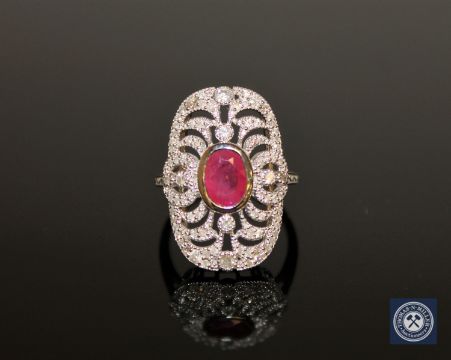 An 18ct white gold ruby and diamond cluster ring, a central oval-cut pinkish-red ruby weighing 0.91 carat, surrounded by eighty brilliant-cut diamonds, millegrain-set in a pierced frame, the diamonds having a total weight of 0.48 carat, of G/H colour and P1 clarity, with certification, to a plain polished shank, size J1/2