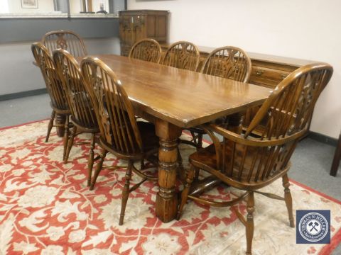 A good quality carved 19th century style oak refectory dining table, 218 cm x 92 cm, together with an excellent set of eight Windsor style dining chairs.