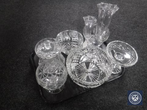 A tray of assorted lead crystal glass ware - candelabra, lidded pot, rose bowl etc