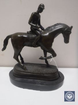 A bronze figure of a horse and jockey on marble base