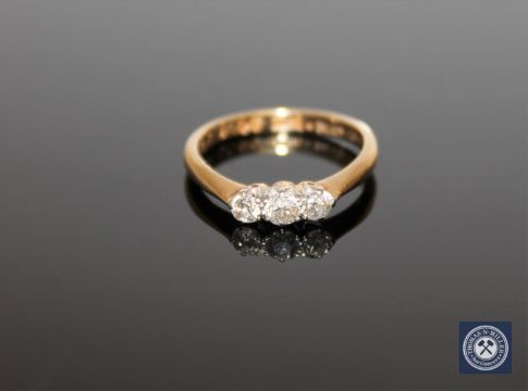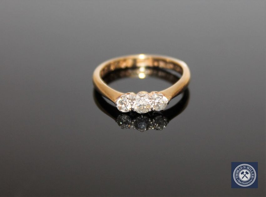 An 18ct gold three stone ring, approximately 0.33ct, size K.