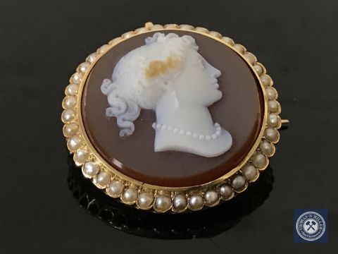 A good quality Victorian stone cameo and pearl brooch, diameter 34 mm.