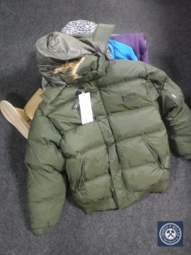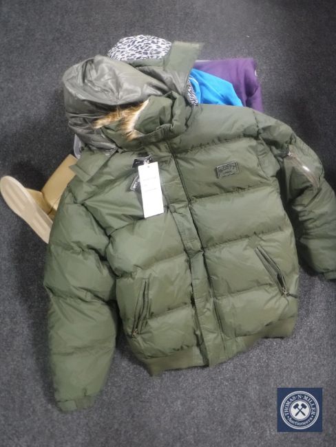 Two boxes containing assorted scarves, boots, blankets, sleeping bags, together with a gents Scott coat