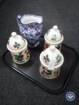 A tray containing a Ringtons Maling chintz water jug together with three Ringtons Fruit Garden lidded storage jars
