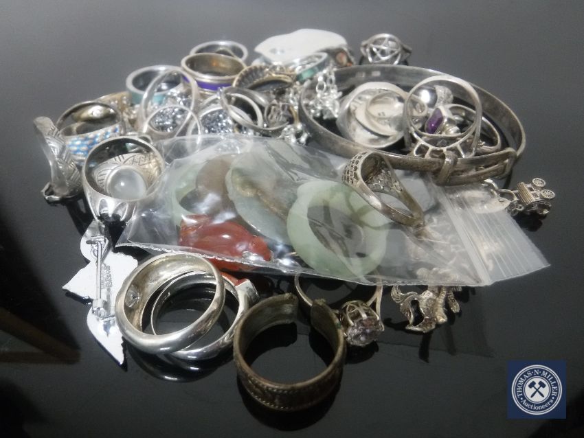 A tub of silver and other jewellery - rings, necklaces, bangles