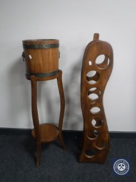 An oak coopered lion mask planter on two-tier plant stand together with a contemporary wine rack