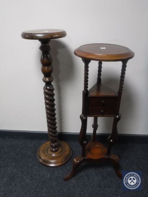 A mahogany wig stand on tripod base together with a pine barley twist torchere