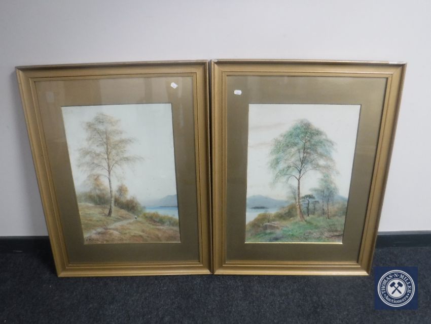 William Baker (1863 - 1937) : A lady walking down a country track with lake beyond, watercolour, signed, dated 1911, 55 cm x 38 cm, together with the companion piece, both parts framed. (2)