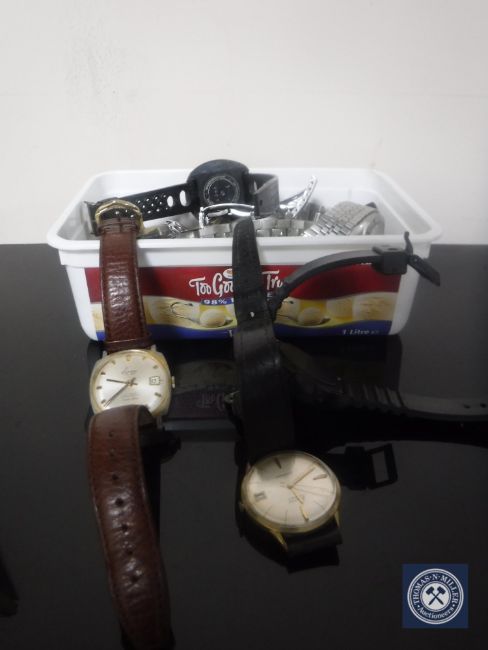 A tub containing a large quantity of assorted gent's wristwatches, Accurist, Aramis etc