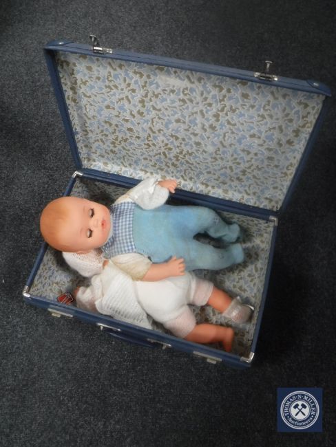 Two mid 20th century luggage cases containing two plastic headed dolls