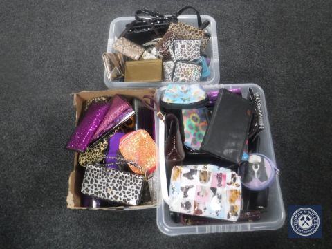 Three boxes containing a large quantity of lady's bags and purses