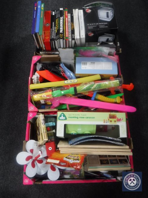 Three boxes containing assorted books, DVD's, TV, toys etc