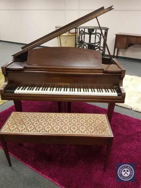 A mahogany baby grand piano by Challen, width 142cm, with duet stool