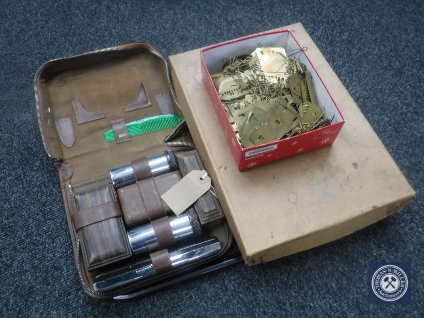 A tray of boxed snooker balls, gent's travel set and a box of brass pins and plates