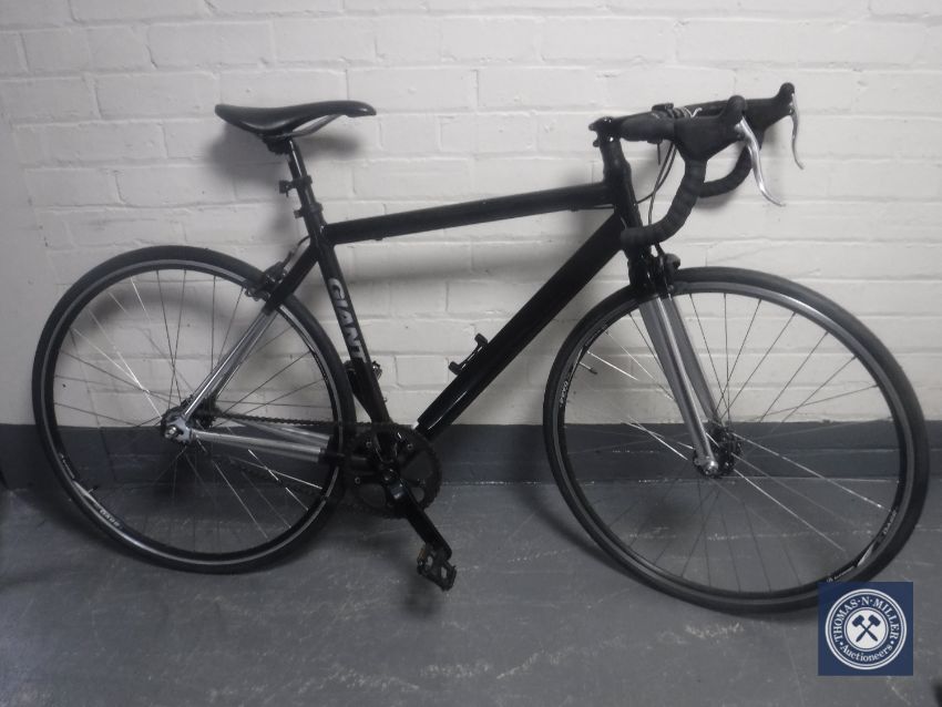 A Giant Compact aluminium frame fixed wheel (fixie) road bike, with new race track tyres (virtually unused)
