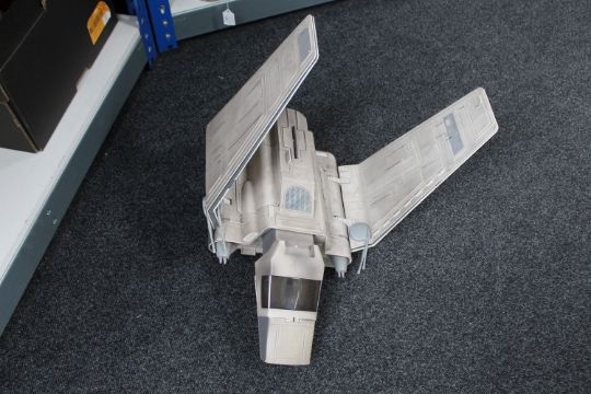 A box of assorted Star Wars ships, Storm Trooper helmets, Death Star cookie jar etc