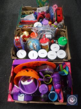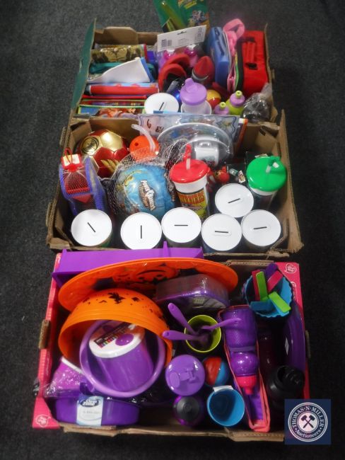 Three boxes containing children's pencil cases, money boxes, footballs etc