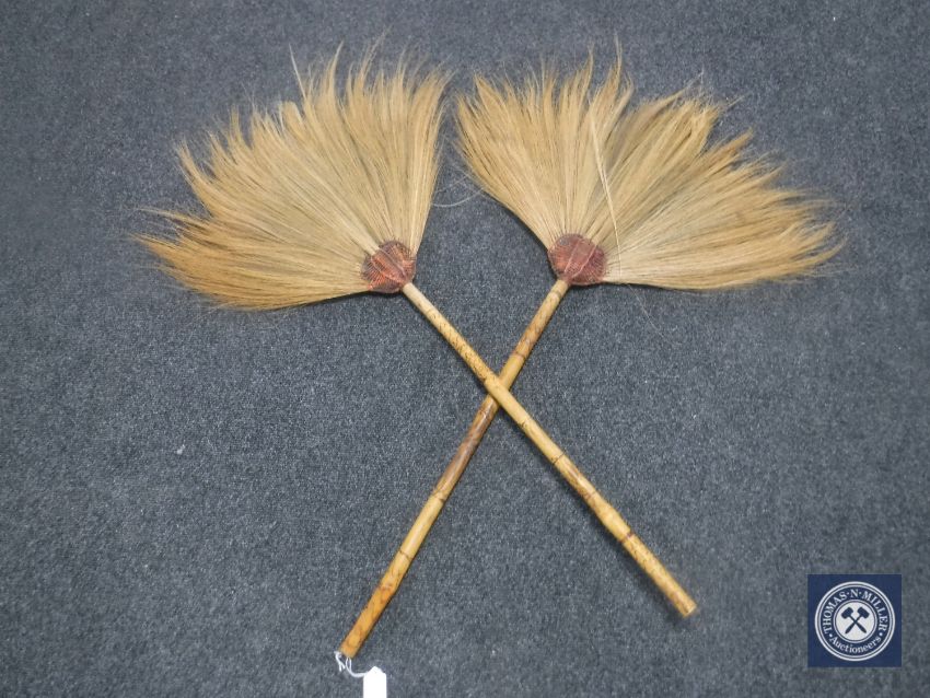 A pair of bamboo handled African fly swatters