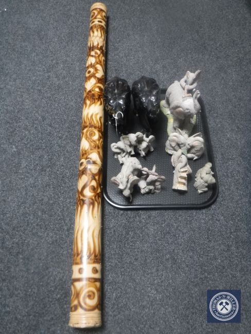 A tray containing seven elephant ornaments and two further wooden elephants and a rain stick
