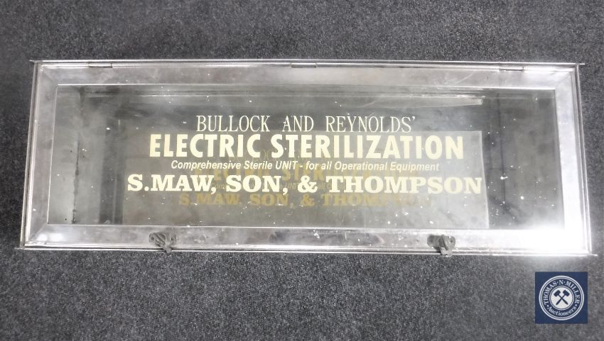 A glazed steel wall cabinet, 'Bullock and Reynolds' Electric Sterilization'