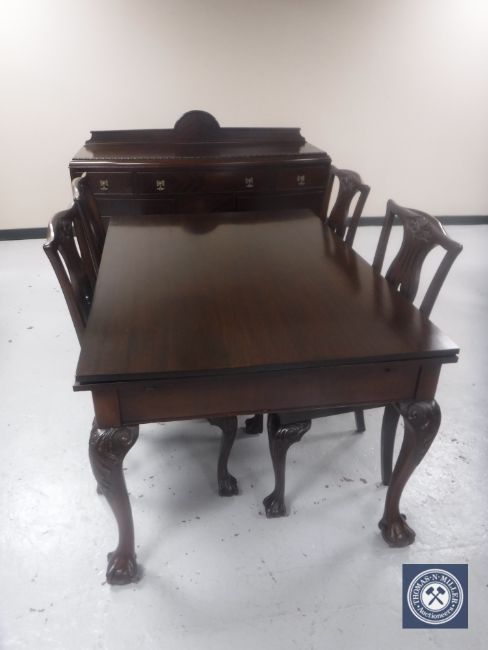A Victorian style mahogany pull out dining table on claw and ball feet, together with a set of four dining chairs and matching bowfront sideboard