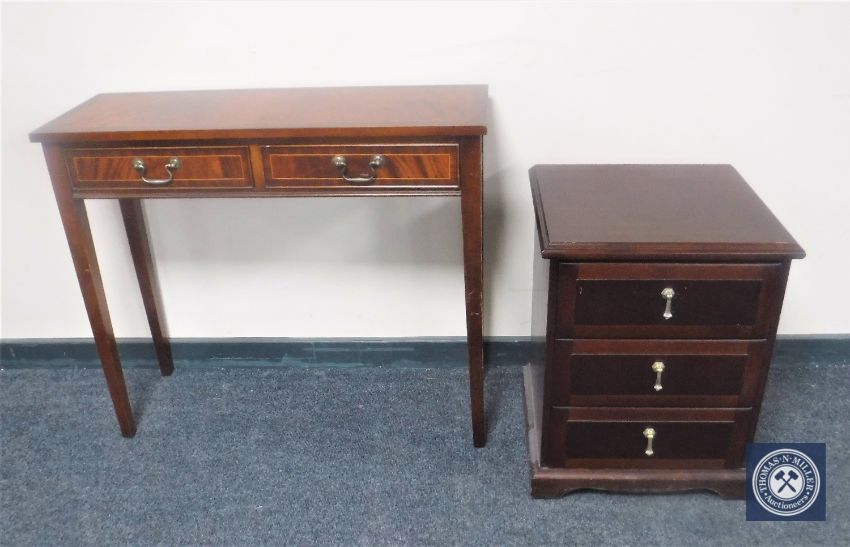 A reproduction mahogany side table and a three drawer chest
