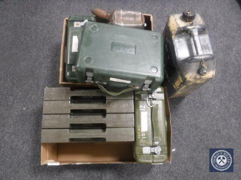 Two boxes of jerry cans, ammunition tin etc